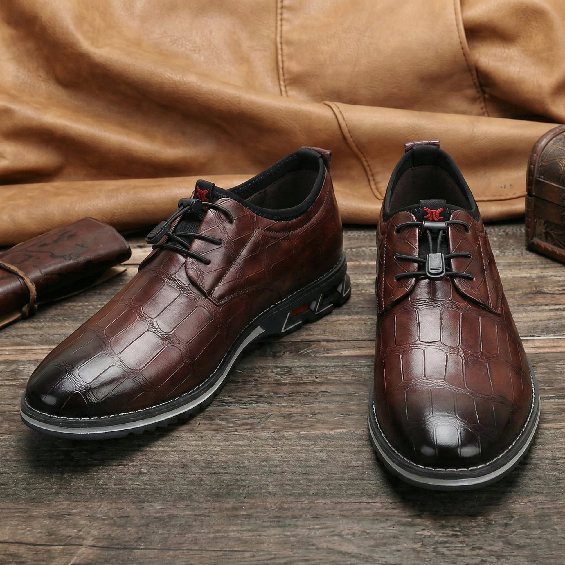 Los zapatos Bordeaux destacan por su acabado texturizado efecto cocodrilo, que aporta una presencia única y sofisticada. Su tono marrón profundo transmite elegancia y personalidad, convirtiéndolos en el complemento ideal para hombres que buscan marcar la diferencia.